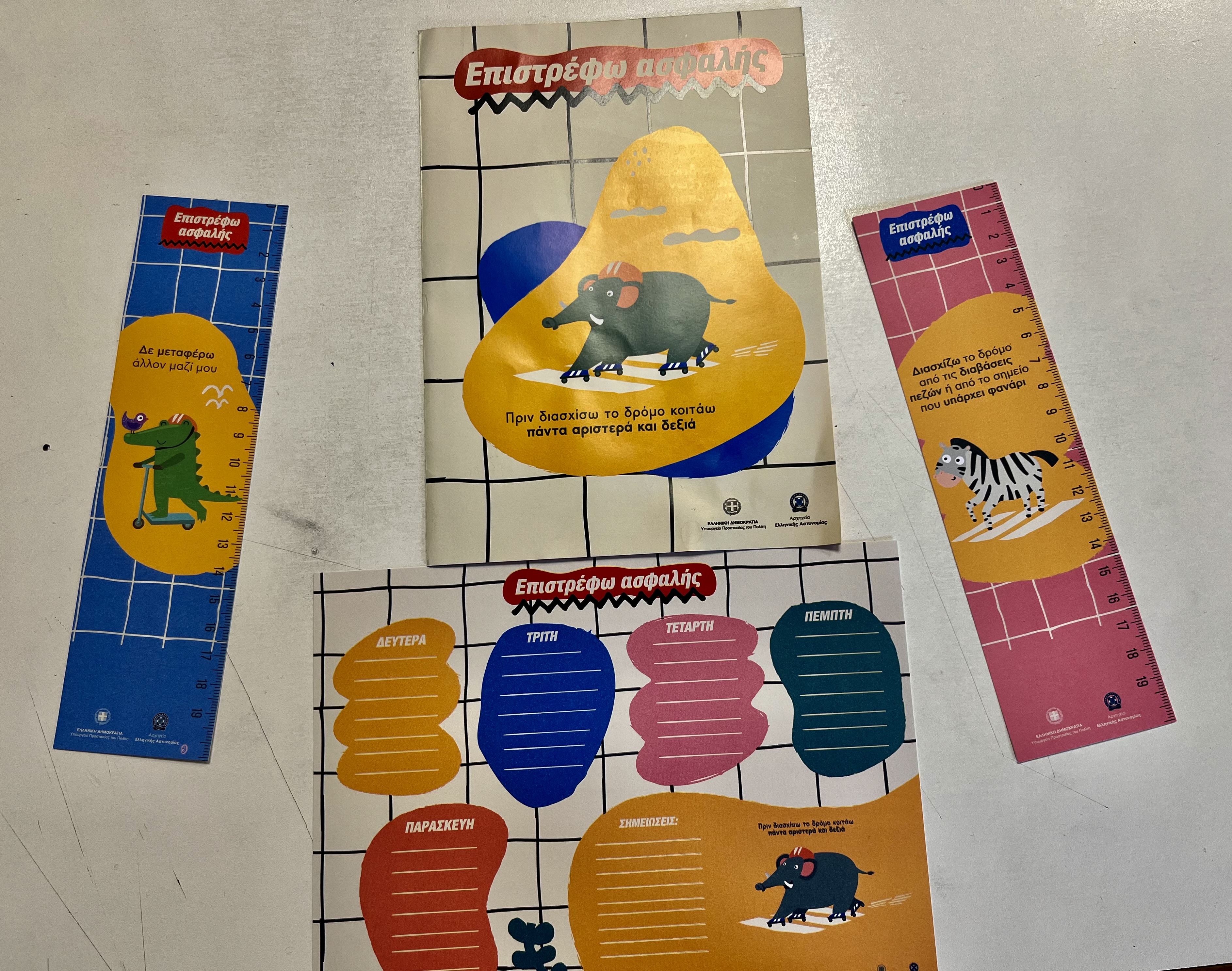 Πρόκειται για υλικό με όμορφα σχέδια, ποικιλία χρωμάτων και σύντομα συμβουλευτικά μηνύματα, κατάλληλο για αφομοίωση από τους μαθητές, ώστε να κυκλοφορούν στο δρόμο με ασφάλεια.